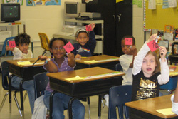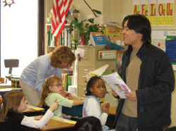 The Chinese lessons Song gives his third grade students at Charter Oak are filled with laughter, energy and enthusiasm. At the start of class, students sing a welcome song in Chinese that is followed by a brief martial arts lesson. The students stand beside their desks in martial arts form and repeat the Chinese commands Song gives them. Students then spend the majority of class time in groups of four or five. One group exercise requires the third graders to write the symbols for Chinese numbers twenty through ninety, eleven through nineteen, and twenty-one through seventy-one. Group work ends each time Song sings a familiar Chinese verse, and students scramble back to their desks. “Ah, this is too easy for you!” Song teases, as the students rattle off their answers.