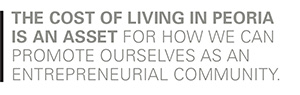 Another key factor was the cost of living in Peoria. I don’t make what I used to make anymore—that was an intentional choice by me, my wife and our family. We chose to change our income profile, but do projects that are more meaningful for us. The cost of living in Peoria became a big part of that equation. It’s actually an asset for how we in Peoria can promote ourselves as an entrepreneurial community. However much money you raise, if you’re trying to bootstrap something, your runway is twice as long in Peoria as it is in Austin, and maybe three or four times as long as it is in Silicon Valley. That matters.