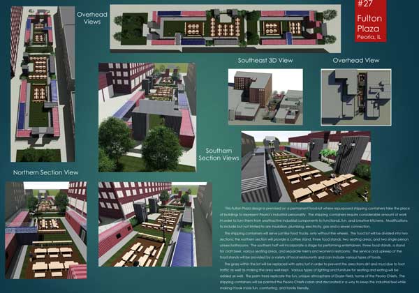 Jason Eich, a Bradley University graduate student, claimed the Student Award and $250 for his concept, also food-related. Eich envisions Fulton Plaza as a permanent “food lot” in which repurposed shipping containers serve as “food trucks” (minus the wheels).